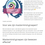 In een mastermind-groep vind je precies die mensen, die wel over deze vaardigheden beschikken. Het zijn ook ondernemers die weten waar het over gaat. En die elkaar begrijpen. Het is erg waardevol met gelijkgestemden aan de slag te gaan met je business.